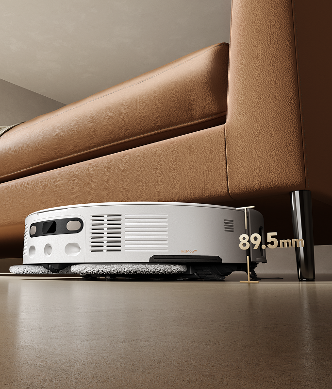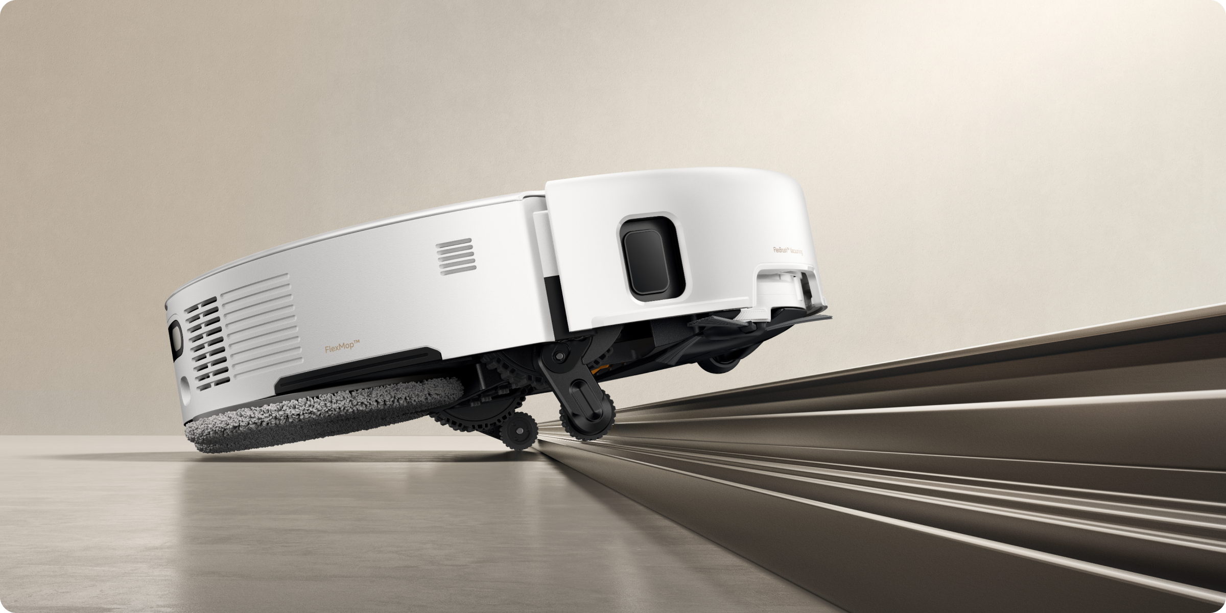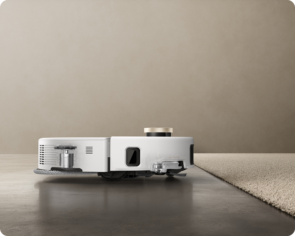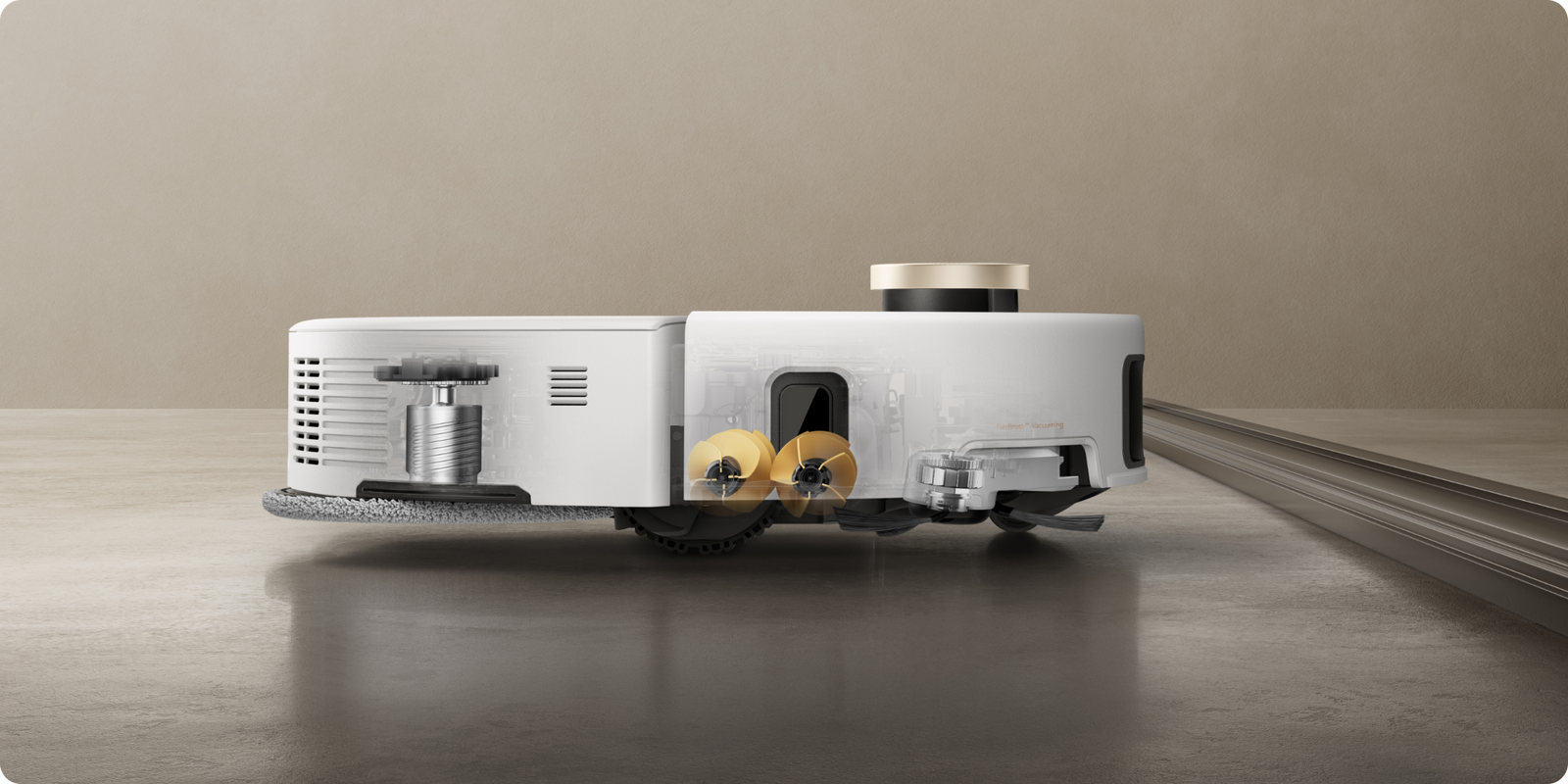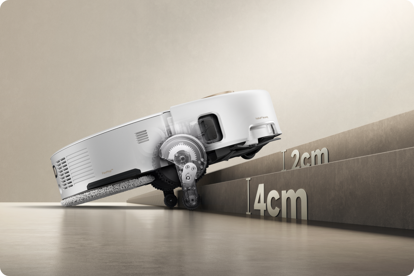 StepMaster™ System features robotic retractable legs that can lift the chassis, allowing it to easily cross over steps, thresholds, door tracks, U-shaped furniture legs, and small obstacles up to 6cm* high. It navigates complex home environments with ease for thorough cleaning and effortless return.