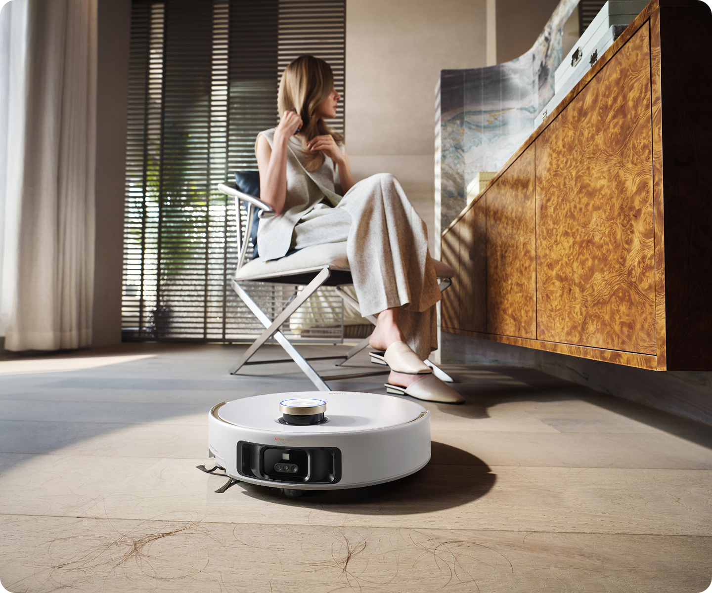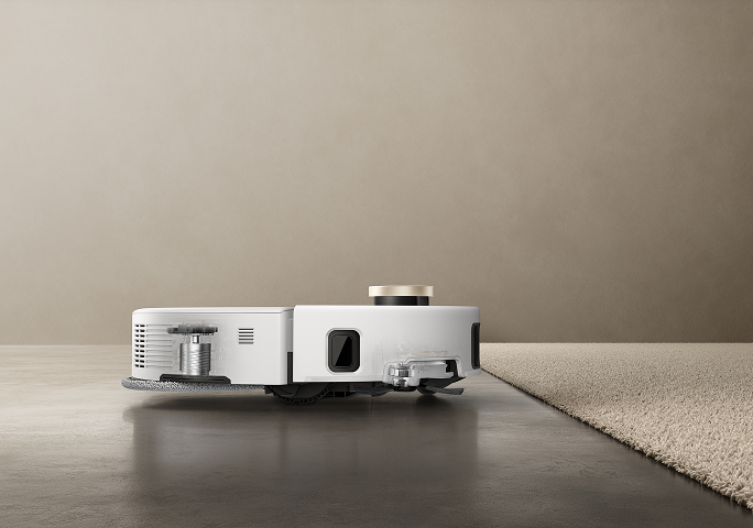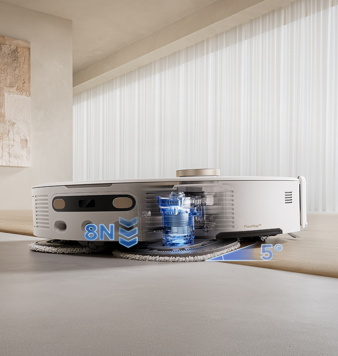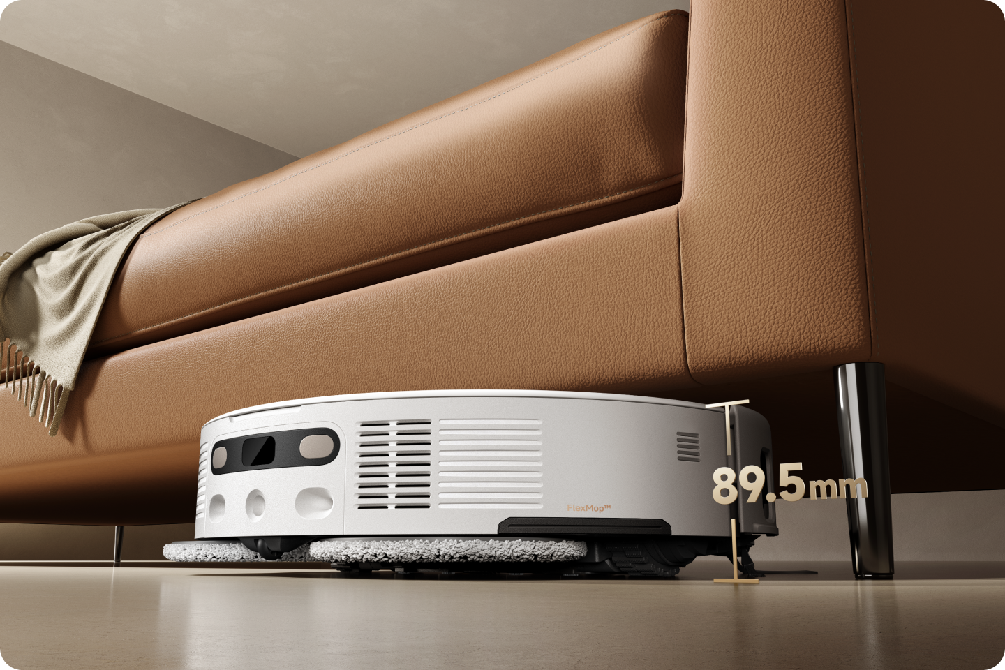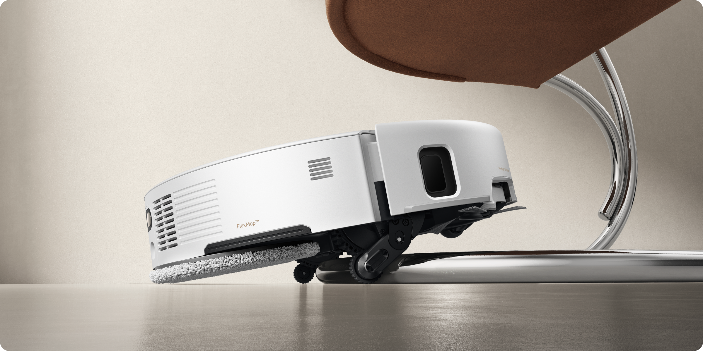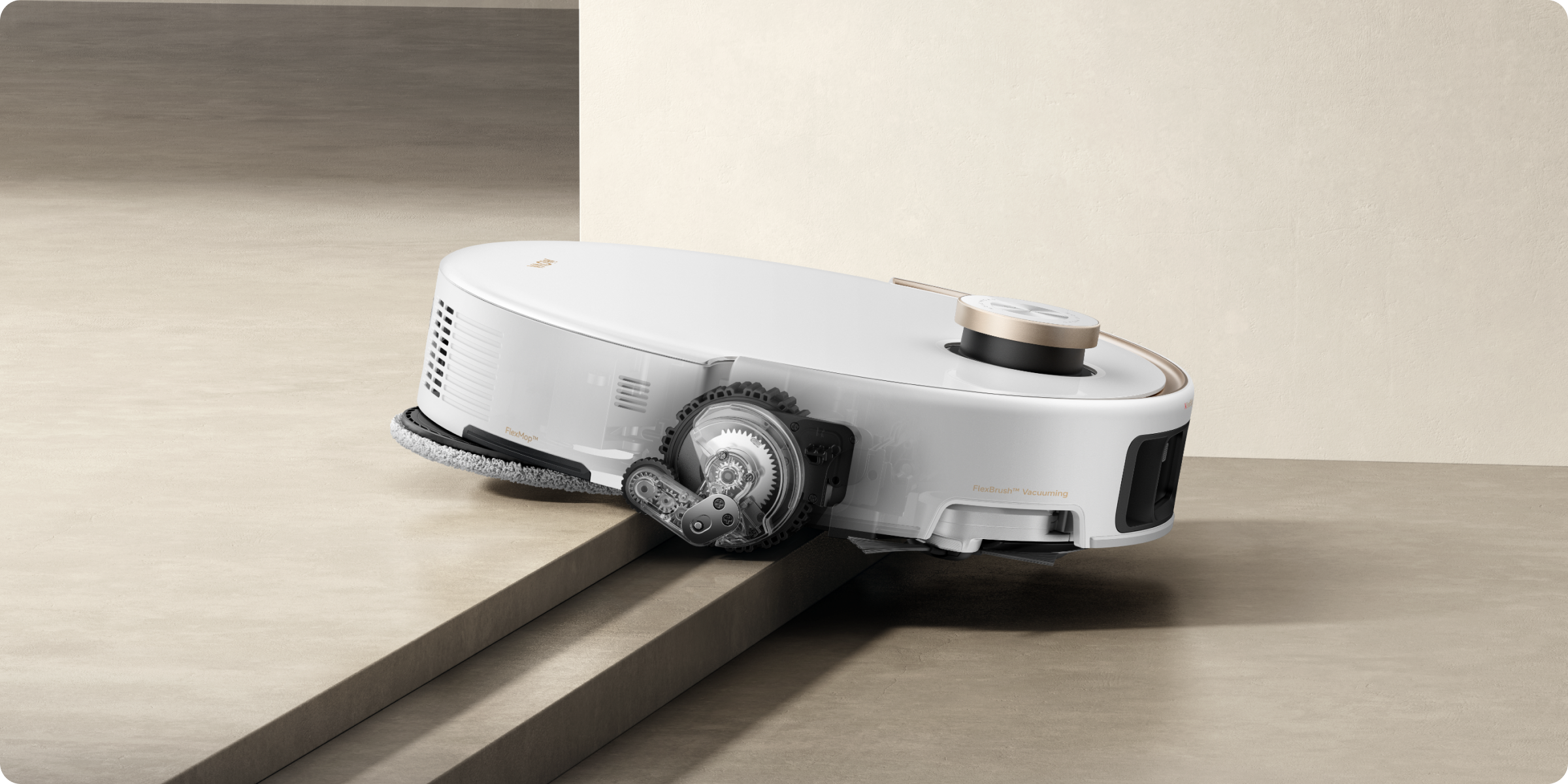 StepMaster™ System features robotic retractable legs that can lift the chassis, allowing it to easily cross over steps, thresholds, door tracks, U-shaped furniture legs, and small obstacles up to 6cm* high. It navigates complex home environments with ease for thorough cleaning and effortless return.
