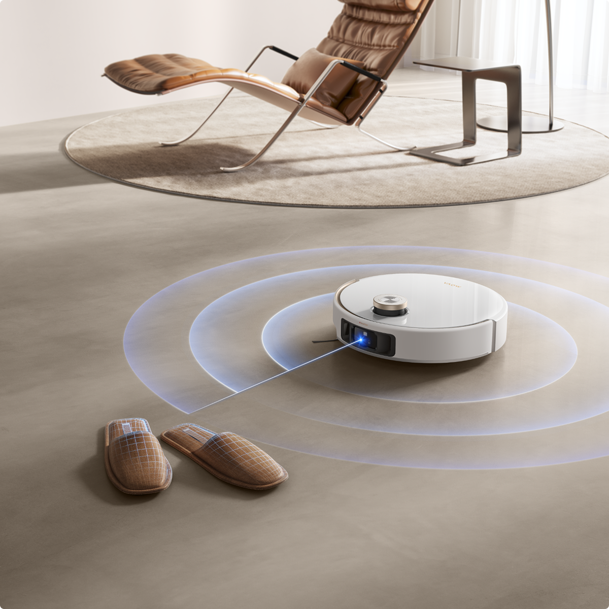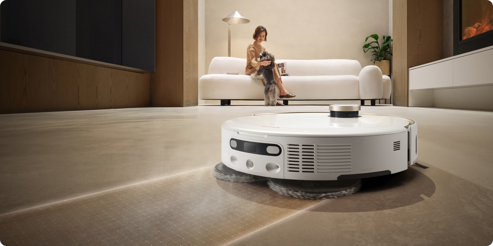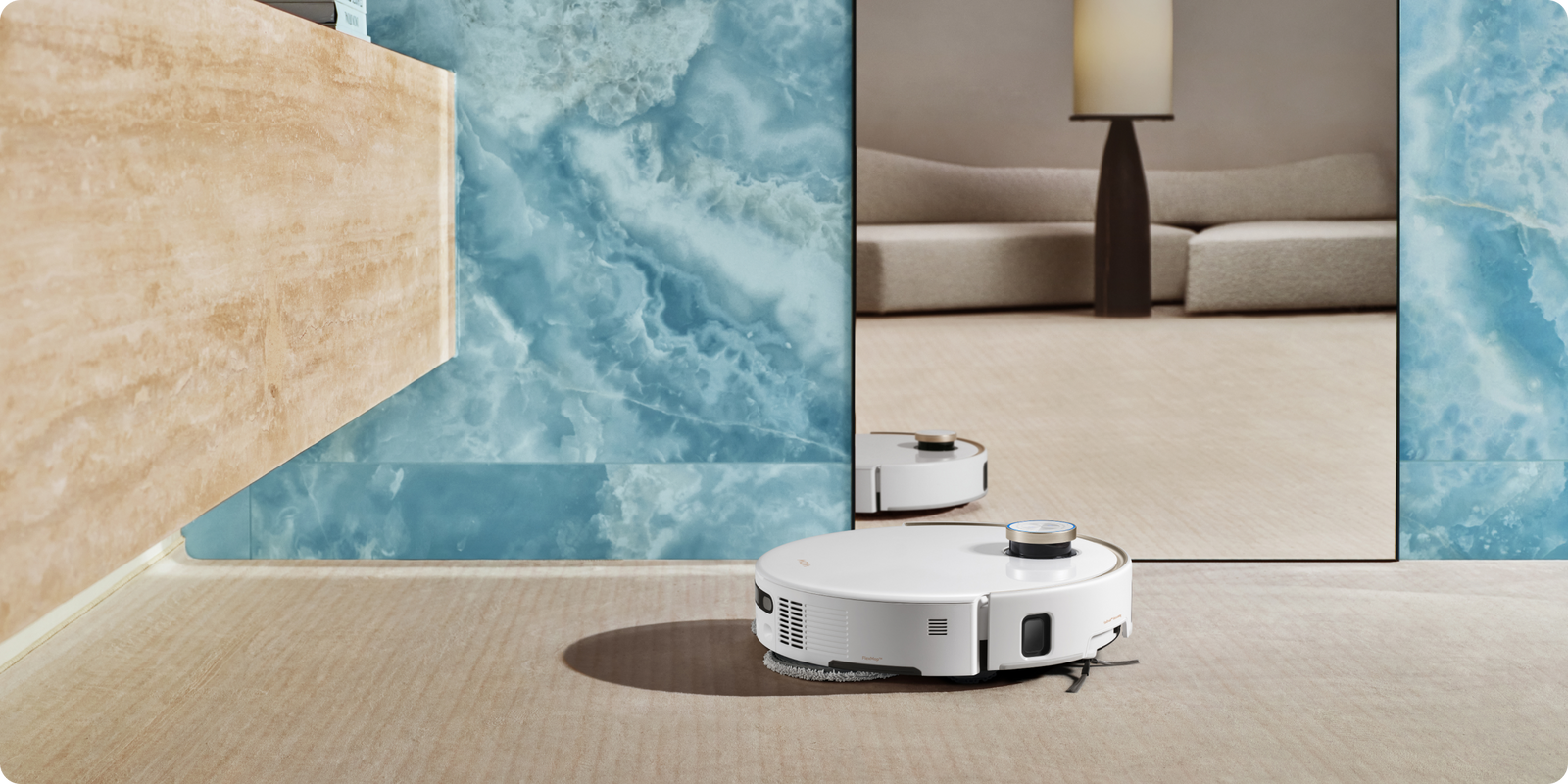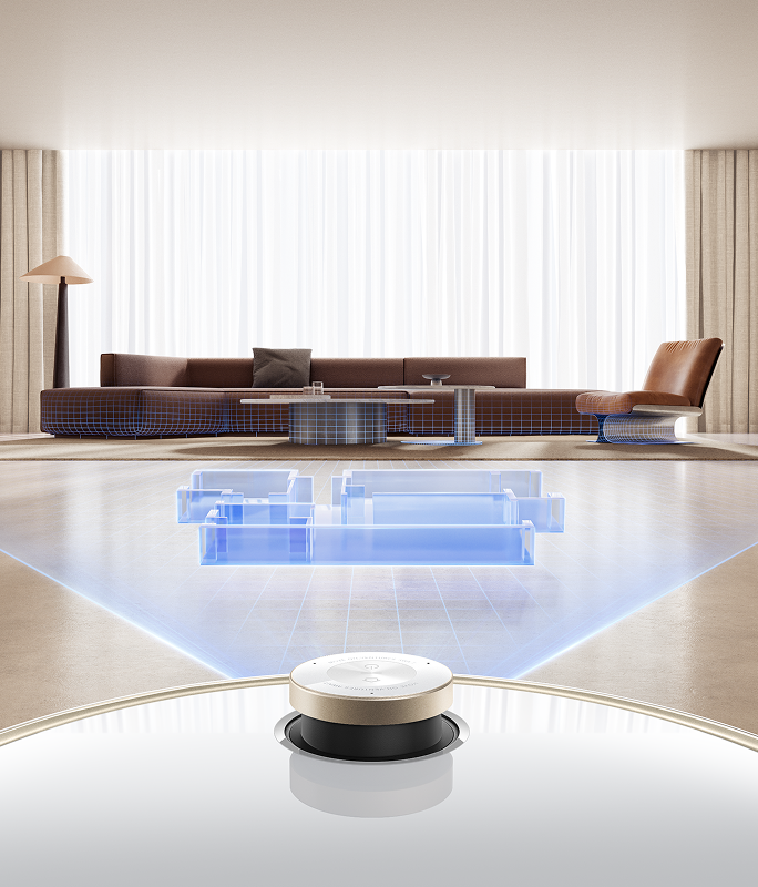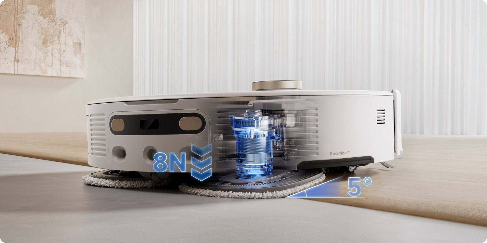 StepMaster™ System features robotic retractable legs that can lift the chassis, allowing it to easily cross over steps, thresholds, door tracks, U-shaped furniture legs, and small obstacles up to 6cm* high. It navigates complex home environments with ease for thorough cleaning and effortless return.