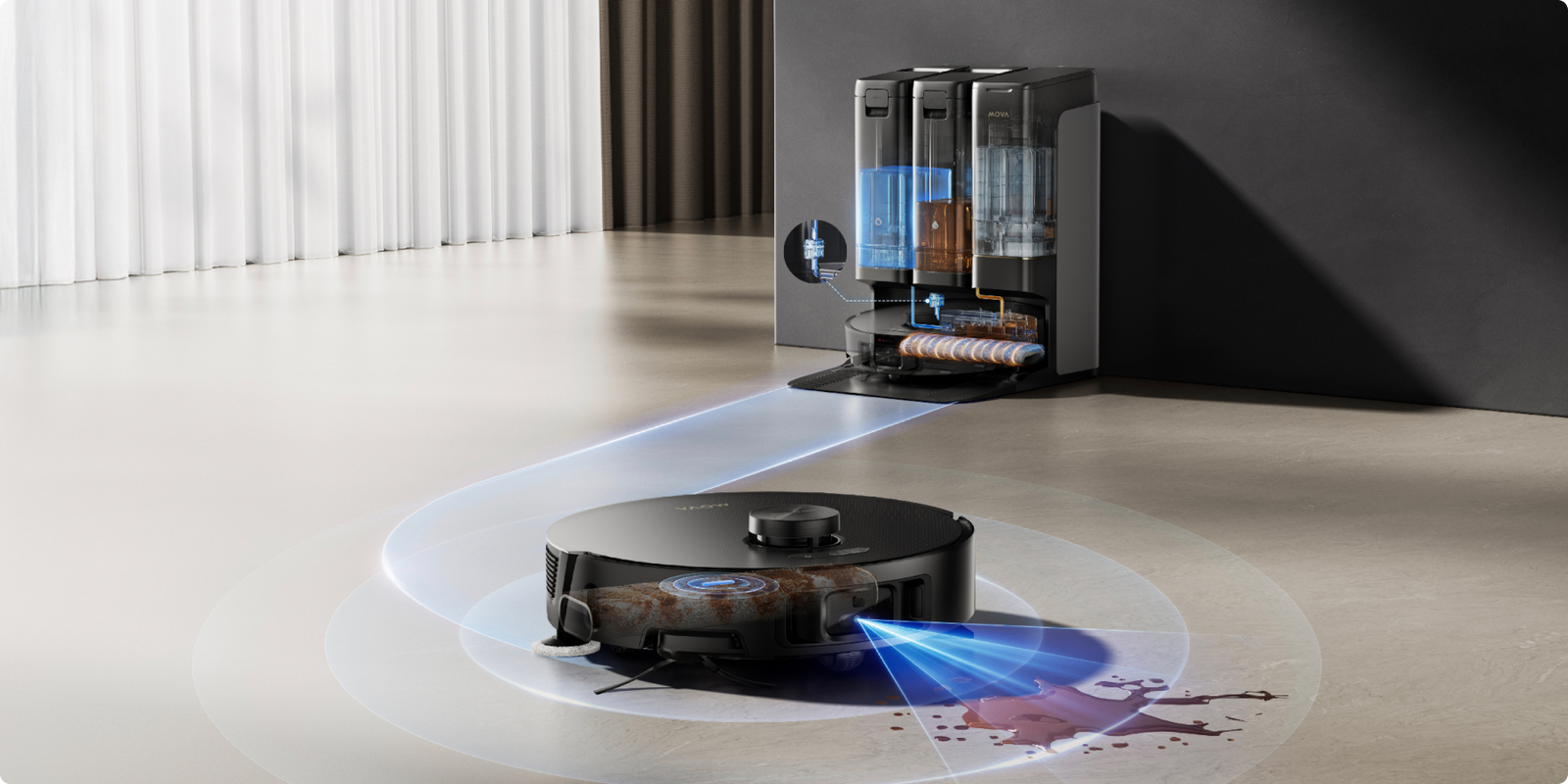 5. * "MOVA Innovation" Real-Time Multiple Dirt Detection: "MOVA Innovation" here refers to the combined use of front AI, dual RGB cameras, built-in color sensor on the mop, and multi-spectural turbidity detection in the base station for smart recognition.